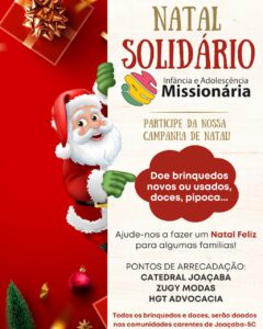 O Natal está chegando e, com ele, a oportunidade de celebrar o nascimento de Jesus e de praticar o bem e o amor ao próximo, participando da nossa campanha solidária de da Infância e Adolescência Missionária, que tem como objetivo levar alegria e esperança para as crianças das comunidades de nosso município Joaçaba.
