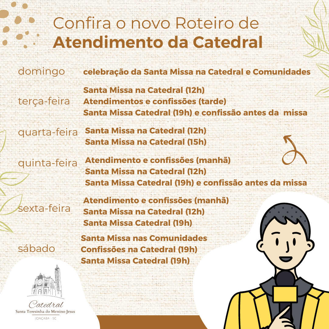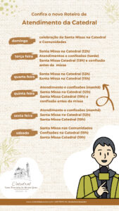 Mas não é só isso. Os atendimentos e as confissões na secretaria, esses momentos de reconciliação e alívio, também têm seus novos compassos. O sacerdote, com sua estola e olhar compassivo, aguarda os penitentes, nas terças feiras no período a tarde, nas quintas feiras de manhã, nas sextas feiras de manhã e aos sábados antes da missa das 19h, também haverá o momento da confissão na Catedral. A celebração da Santa Missa aos domingos na Catedral e nas Comunidades permanecem com seu habitual calendário.