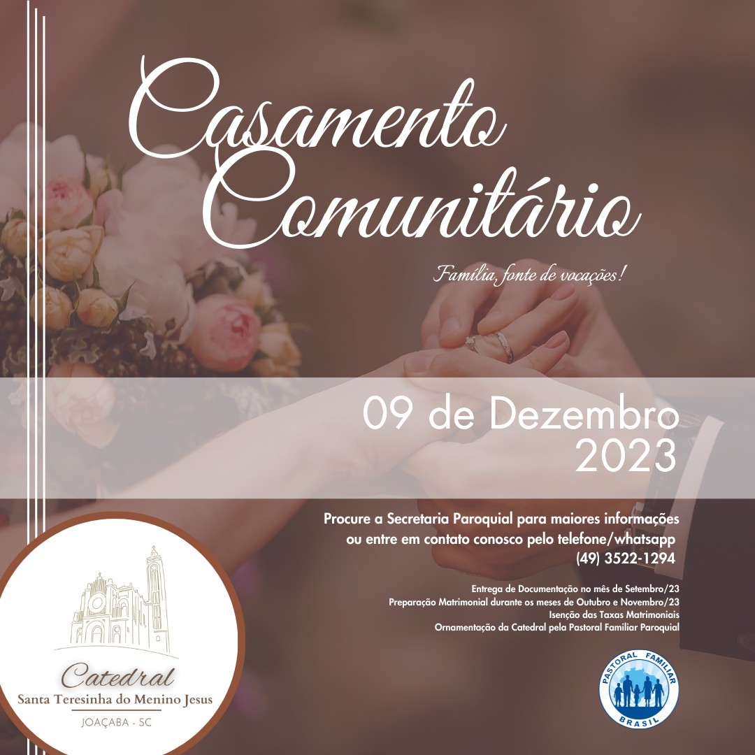 Vem aí mais uma edição do Casamento Comunitário promovido pela Pastoral Familiar Paroquial! Maiores informações na secretaria paroquial!