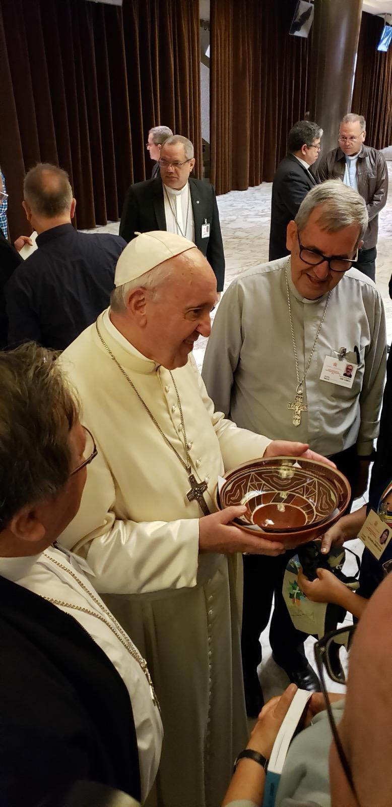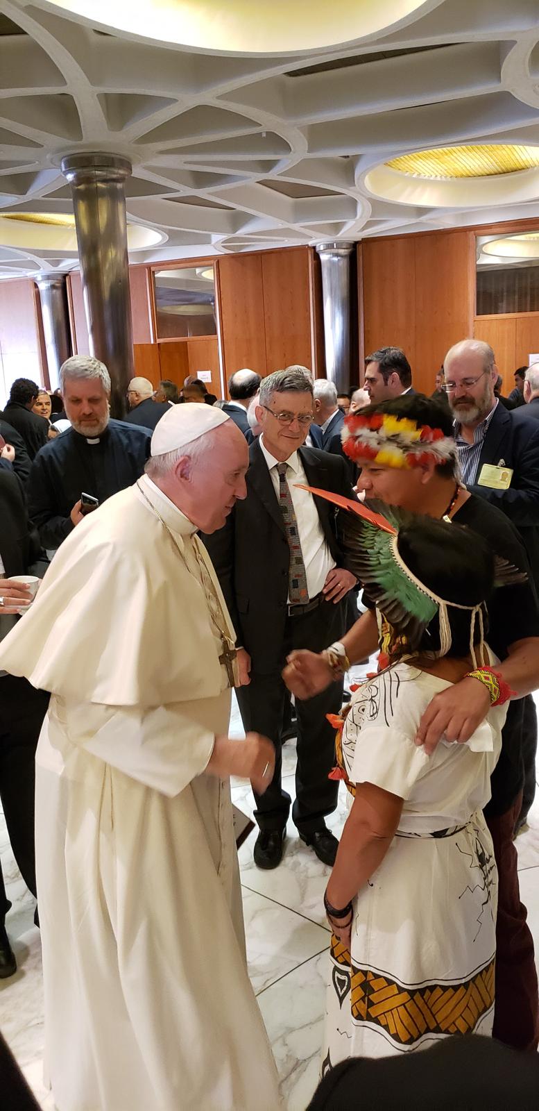 Pe. Leandro: “Eu encontrei o Papa Francisco em quatro ocasiões. Dentre essas, a primeira, que se estendeu por vários dias, foi o Sínodo da Amazônia, realizado pela Igreja em 2019. Nesse evento, pude acompanhar um Francisco com muito mais saúde, um Francisco que caminhava entre as pessoas. Nos intervalos das audiências, dos encontros e das reuniões do sínodo extraordinário para a Amazônia, o Papa Francisco demonstrava seu carisma acolhedor, recebendo os grupos indígenas da região amazônica, além de muitas outras pessoas que participavam daquele momento histórico. Com paciência e atenção, ele escutava e acolhia a todos. Essa atitude refletiu o espírito que ele sempre manifestou ao longo de seu pontificado: o de um Papa da acolhida.”