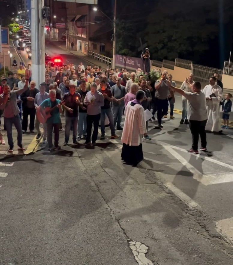 A procissão foi marcada por um clima de reverência e emoção. A imagem de Nossa Senhora das Dores saiu da Paróquia Bom Jesus de Herval do Oeste, enquanto a imagem do Senhor dos Passos partiu de outro ponto da cidade de Joaçaba. As duas procissões se encontraram em frente ao Santuário Catedral Nossa Santa Teresinha, em um momento de silêncio e oração que simbolizou o doloroso encontro entre Mãe e Filho. Os fiéis, acompanharam com velas acesas, criando uma atmosfera de luz e união. O envolvimento da comunidade foi um dos destaques do evento. Famílias inteiras participaram, unindo gerações em um testemunho vivo de fé. Crianças, jovens, adultos e idosos caminharam lado a lado, demonstrando que a devoção a Maria e a Jesus transcende idades e fortalece os laços comunitários. A Procissão do Encontro não foi apenas um ato de devoção, mas também um convite à reflexão. O encontro de Jesus e Maria nos lembra que o amor e a dor caminham juntos na história da salvação, mas que a esperança sempre prevalece. Este gesto de fé reforça a mensagem de que, mesmo nas situações mais difíceis, Deus está presente, nos sustentando e guiando.