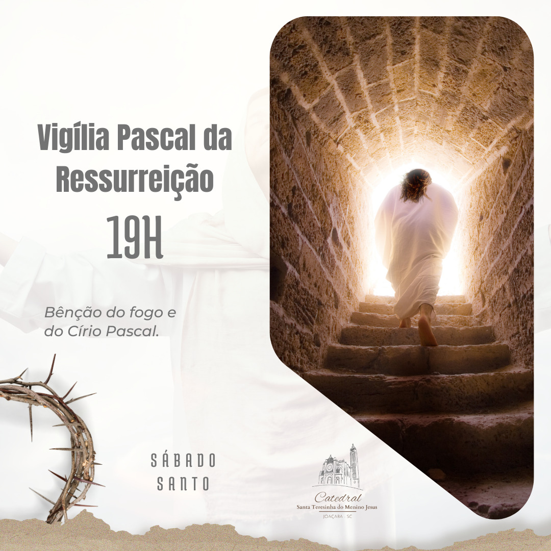 É com alegria e esperança que convidamos vocês para uma experiência profunda e significativa no Sábado Santo, dia 30 de março, às 19h. Nessa noite sagrada estaremos todos reunidos para celebrar a Vigília Pascal, resgatando o verdadeiro sentido da Páscoa, contemplando o túmulo vazio, lembrando-nos da morte de Jesus e da espera pela sua ressurreição, nessa noite a esperança renasce. Esperamos vocês!