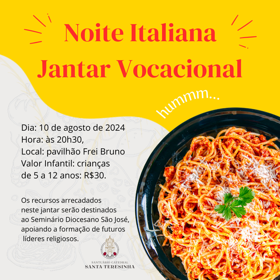 Você está convidado para uma experiência gastronômica única na Noite Italiana Jantar Vocacional! Este evento especial acontecerá no dia 10 de agosto de 2024, às 20h30, na Catedral Santa Teresinha, no pavilhão Frei Bruno.
