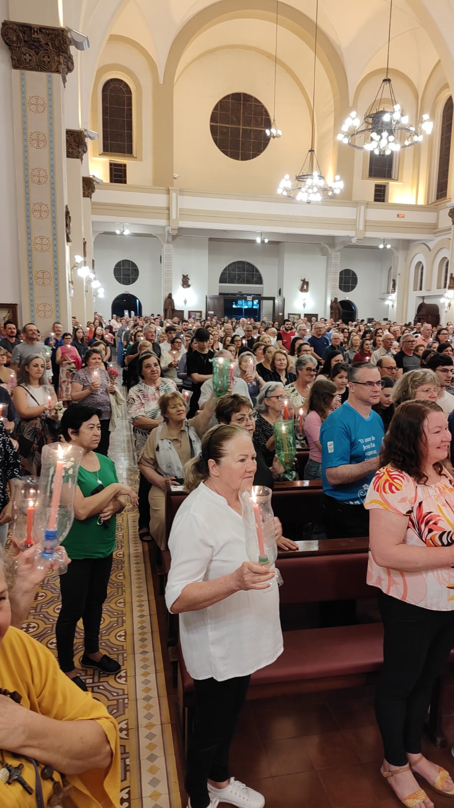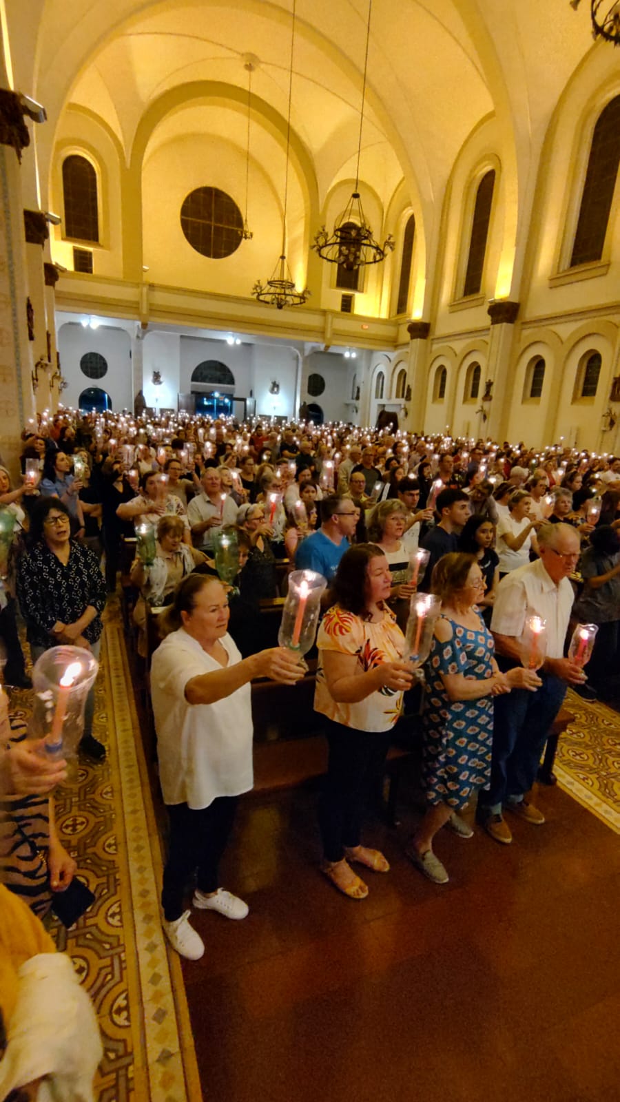 Ao cair da noite, a procissão luminosa iluminou as ruas, criando um espetáculo visual emocionante. Fiéis carregando velas caminharam em oração, enchendo o ambiente de uma atmosfera de paz e reflexão. A procissão culminou na catedral, onde todos foram recebidos com bênçãos especiais. A catedral, por sua vez, foi o ponto alto do dia, reunindo todos os participantes para um momento de oração e agradecimento. As bênçãos foram ministradas a todos os presentes, reforçando o sentimento de comunidade e fé.