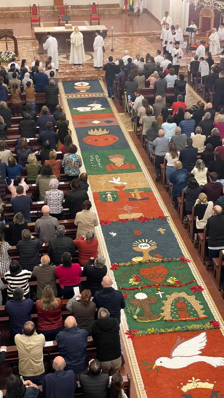 Na última quinta-feira, vivemos intensamente a Solenidade de Corpus Christi, uma das festas mais belas da nossa fé, em honra ao Santíssimo Corpo e Sangue de Cristo. A celebração no Santuário Catedral Santa Teresinha reuniu fiéis em oração, adoração e profundo amor à Eucaristia. Desde as primeiras horas da manhã, nossa comunidade se mobilizou para preparar os tradicionais tapetes, expressão artística e devocional que embelezam o caminho por onde passa o Santíssimo Sacramento. Foram metros e metros de fé transformada em cor, símbolo e entrega — desenhados com cuidado, criatividade e oração.
