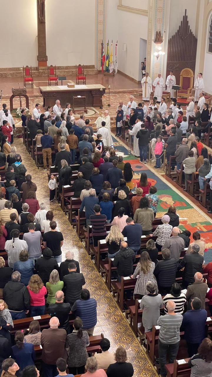 A Santa Missa solene contou com a presença expressiva dos fiéis, pastorais, movimentos e famílias. A liturgia nos recordou que, na Eucaristia, Cristo se faz real e presente, alimento para a alma e sinal da nova aliança. Devido às condições climáticas, este ano a procissão aconteceu pelos corredores do próprio Santuário, levando o Santíssimo Sacramento, proclamando nossa fé em Jesus presente na hóstia consagrada. Os momentos de adoração ao longo do percurso foram marcados por cânticos, silêncio reverente e orações profundas. Crianças, jovens, idosos — todos unidos em um só coração diante do Mistério da nossa fé.